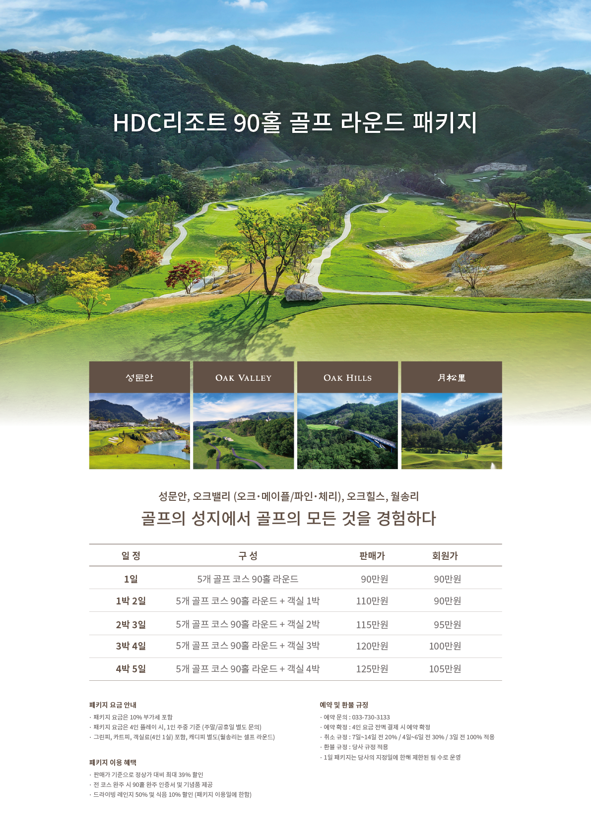 이소연 골프 부문장은 “국내 최대 규모인 90홀 골프 코스의 완성을 통해 최상의 골프 레저 문화 선도와 새로운 도약을 기념하여 HDC리조트의 5개 골프 코스를 모두 경험할 수 있는 스페셜 패키지를 출시한다. 성문안, 오크밸리(오크·메이플 / 파인·체리), 오크힐스, 월송리 5개 코스에서 각기 다른 개성과 재미의 다채로운 골프 라운드를 만끽할 수 있으며 오크밸리 리조트 객실 숙박, 기념 선물 혜택 등도 포함된다.”라고 밝혔다. 90홀 골프 라운드 패키지 상품은 1일 내에 90홀 라운드를 즐기는 구성부터 1박 2일에서 최대 4박 5일 동안 골프와 숙박을 함께 여유롭게 즐기는 구성 중 선택할 수 있으며 가격은 주중 기준 90만원부터다.