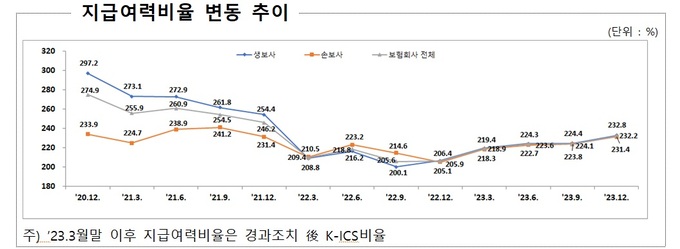금감원은 지난해 말 기준 보험사의 경과조치 후 지급여력비율은 232.2%로 안정적인 수준을 유지한다고 설명했다. 금감원 관계자는 “다만, 금융 시장의 불확실성이 지속 증대되고 있는 만큼 취약 보험사 중심으로 충분한 지급여력을 확보할 수 있도록 철저히 감독할 것”이라고 말했다.