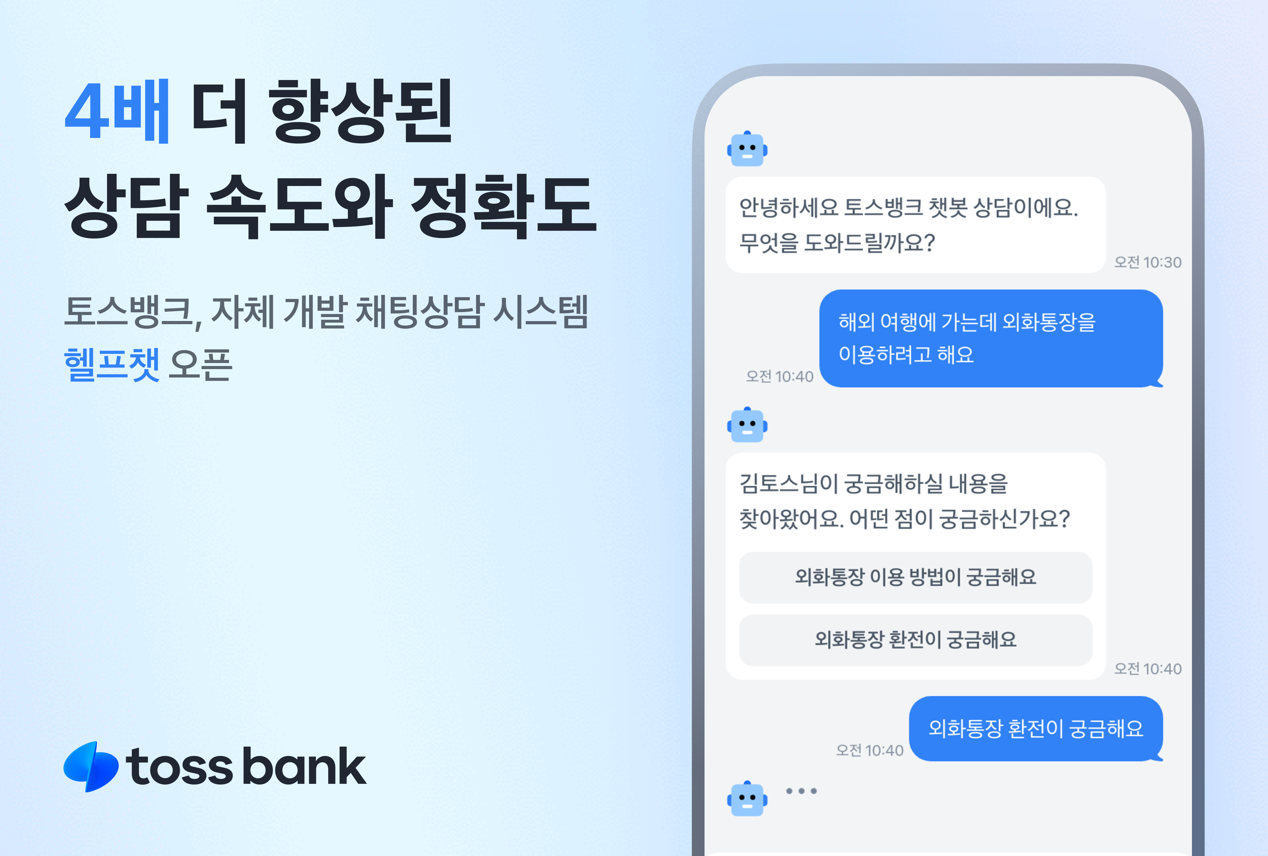 이 모든 과정은 즉답으로 이뤄지며, 고객들은 빠르게 안내를 받을 수 있다. 기존 토스뱅크가 운영하던 외부 솔루션 대비 4배 가량 빨라진 속도다. 응답 속도의 향상과 고객형 구체적 해결책 제시는 자체 개발과 내재화를 통해 비약적인 발전이 가능했다.