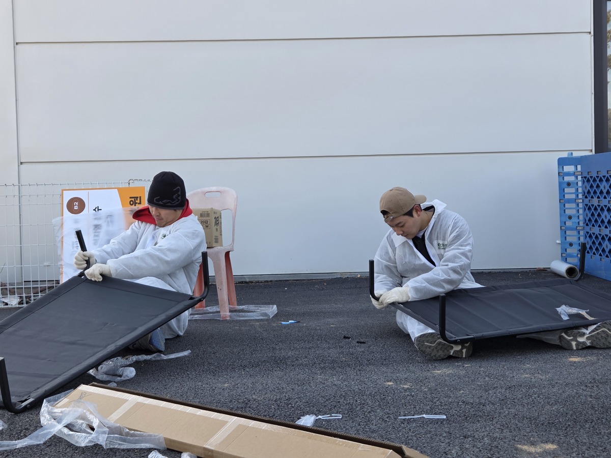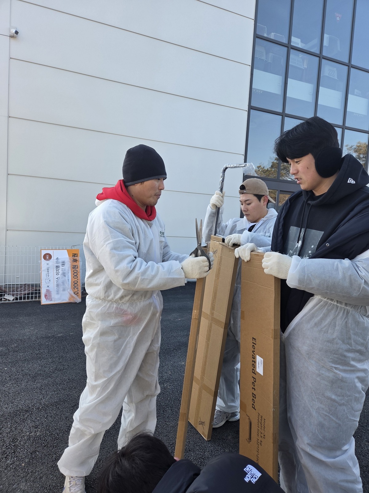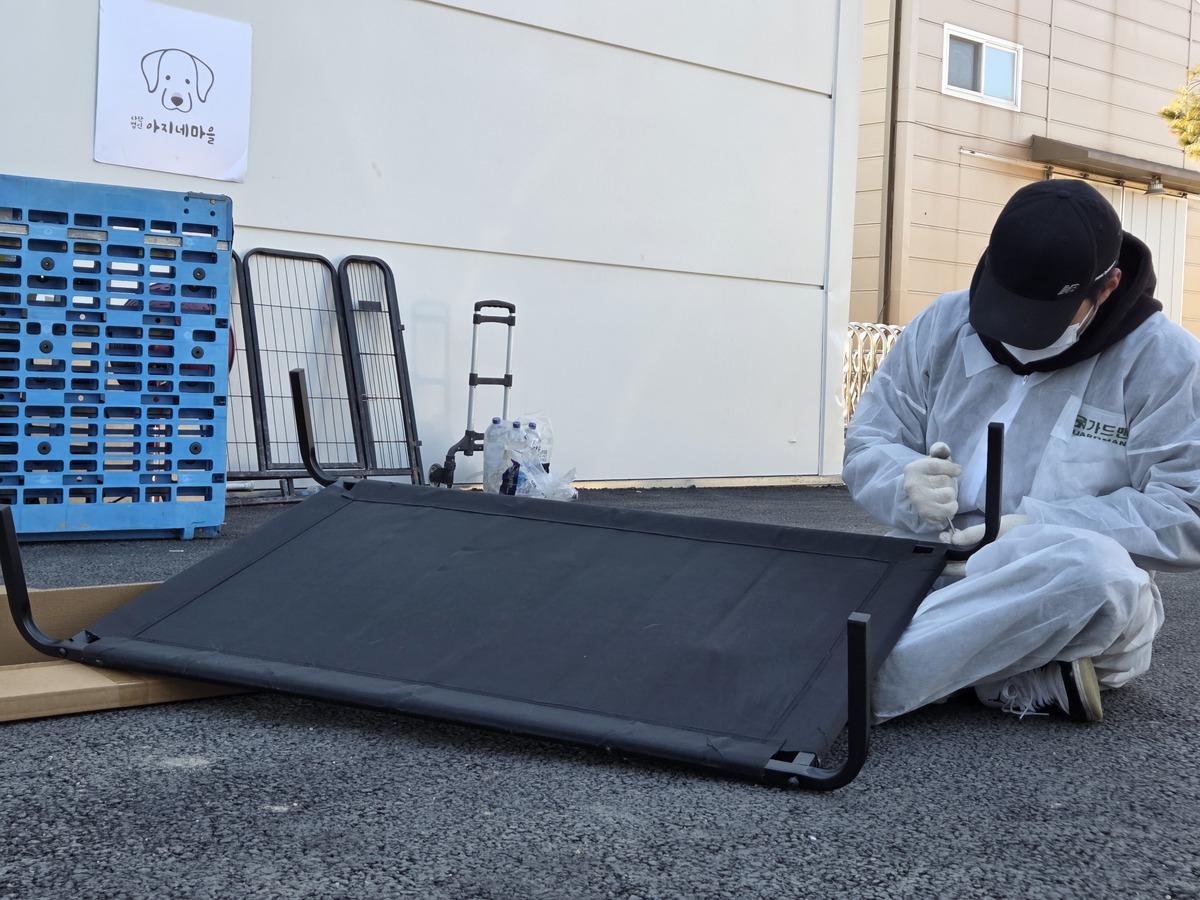 보호소의 추운 견사 바닥을 피하게 해줄 간이 침대 조립은 건장한 운동선수들도 낑낑댈 만큼 힘든 작업이었다. 그래도 다들 1인분 이상을 하면서 총 14개 침대가 완성돼 견사로 투입됐다.